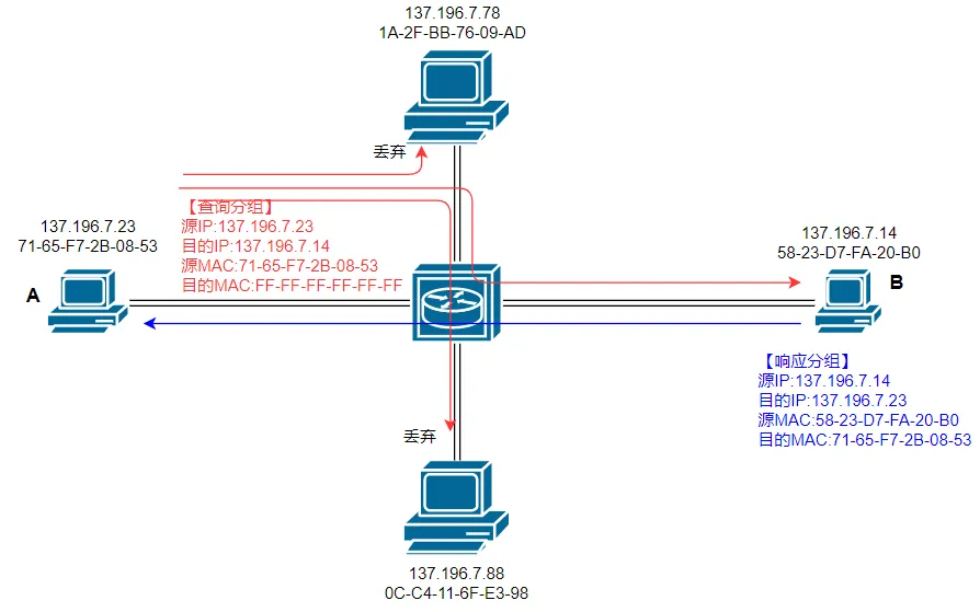 主机 A 构造的查询分组将在该局域网内广播,理论上,每一个设备都会收到该分组,并检查查询分组的接收 IP 地址是否为自己的 IP 地址,如果是,说明查询分组已经到达了主机 B,否则,该查询分组对当前设备无效,丢弃之。
